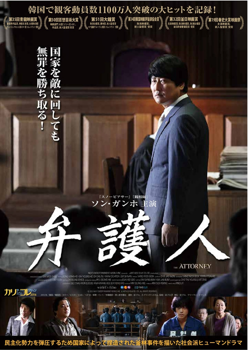 韓国で実際に起こった「釜林(プリム)事件」とこの事件を機に人権派弁護士へと転身した故・盧武鉉(ノ・ムヒョン)元大統領を題材に、軍事政権の不条理に立ち向かう姿を丁寧に描くとともに、民主化へと移り変わっていった激動の時代と韓国の暗部も克明にあぶり出す。韓国での公開当時、歴代観客動員数8位になり、1,100万人以上を動員、ロングランヒットを記録した。主人公のソン弁護士を演じるのは、韓国が誇る名優、ソン・ガンホ。主演作は軒並みヒットを記録し、本作が韓国で公開された2014年には韓国トップスター賞や第35回青龍映画賞で主演男優賞を受賞。圧倒的な存在感を放っている。